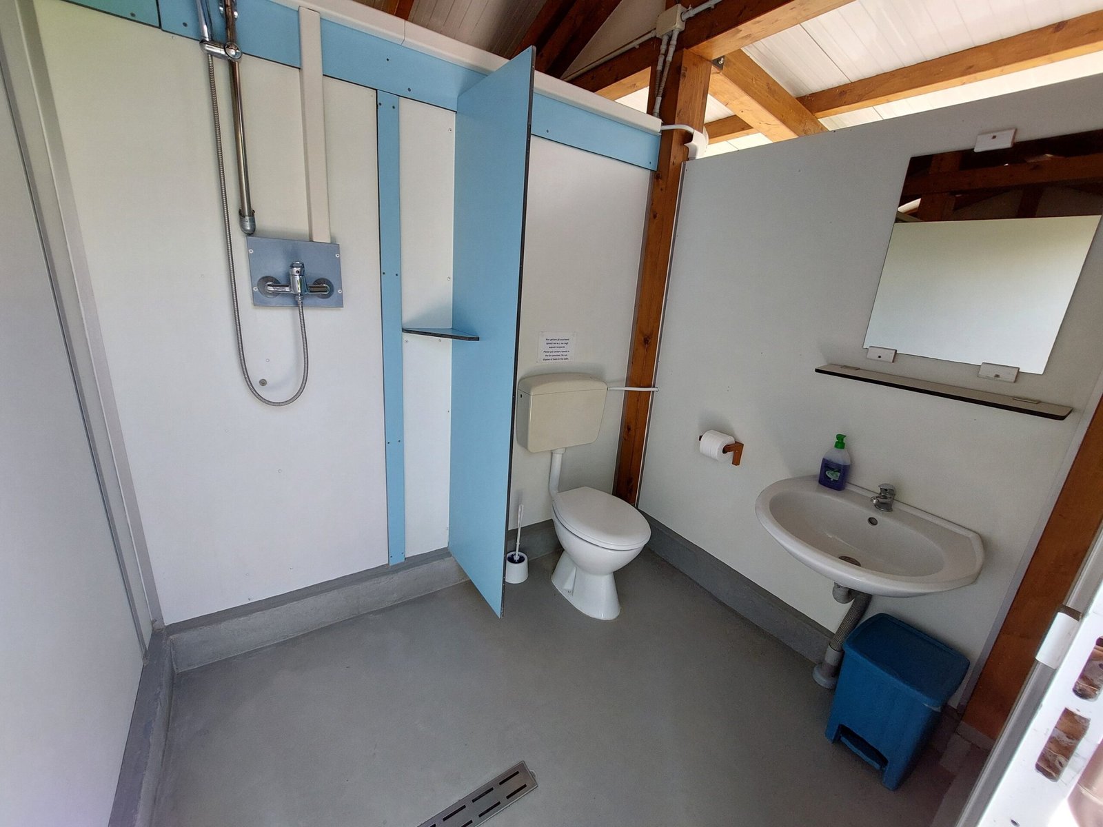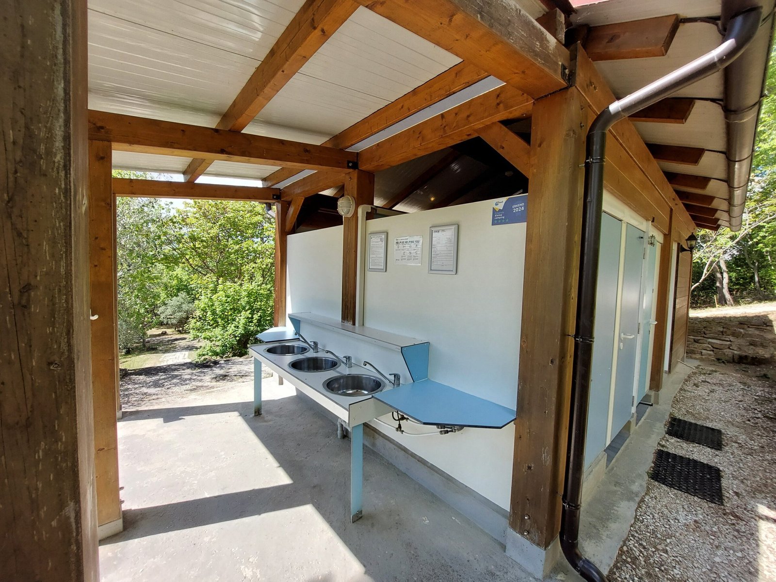 There is a sanitary unit with 4 bathrooms, at the back of this unit there are 3 sinks with hot & cold water.